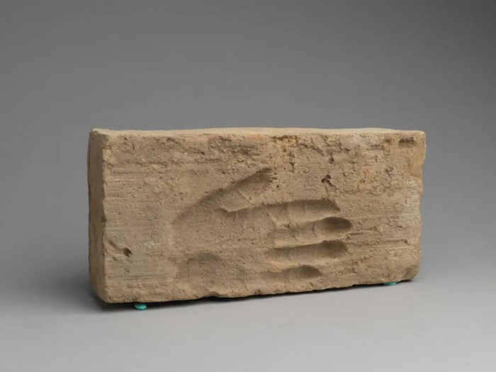 按有手掌印的条砖,被称作“手印砖”。手印一般按在宽面上,一砖一印,多为成人的右手掌印。值得注意的是,这种手掌印可能为工匠在搬运或从模具中提取还没有干透的砖坯时而留下的;或是作为标识,以便按手索骥,追责到人;或是砖匠在制砖时即兴所留的记号;也有可能与某种风俗有关。