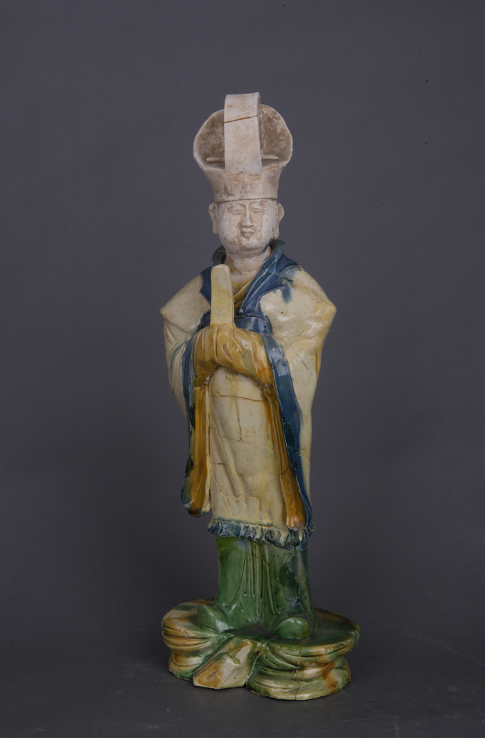 头戴单梁冠,面微向左,五官刻画紧凑,目视前方,身向前倾。上着白色阔袖中长袍,下饰流苏,胸部束宽带,背后带长垂至地,下着绿色长裙,露出脚尖。双手执笏板于胸前,作侍奉状。通体施黄、蓝、白、绿等色釉,釉色搭配鲜明,如白色中长袍的袖口和领口施蓝釉。直立于山石形台座上。