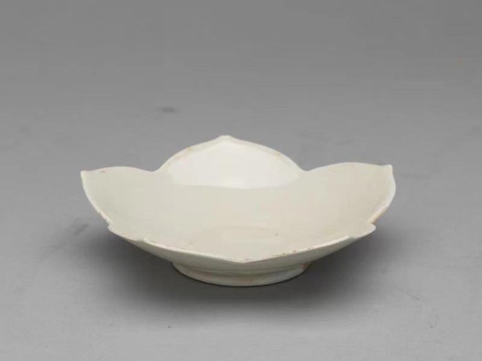 圆形弧腹内均匀分布四朵宝相花,内侧底部凸出如浅盘状。外侧素面,下有喇叭形圈足,底部平坦,茶托表面鎏金。