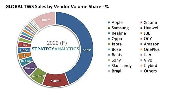 今年第三季度,苹果在可穿戴设备、家居设备和配件一项营收87.8亿美元,相比2020年同期的64.50亿美元大幅增长了36%。Strategy Analytics的数据显示,AirPods在2020年的全球无线耳机销售额中占比接近50%。