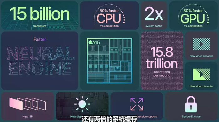 据介绍,iPhone 13全系搭载了自研A15仿生芯片,5nm制程工艺,集成了150亿晶体管,库克称之为“最强iPhone”。