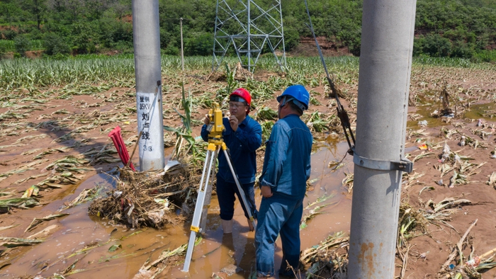 在40℃的高温下,董景峰一边盯着抢修现场的风险点,一边指导抢修人员用经纬仪观测定点,还不忘给大家分发防暑药物。豆大的汗珠从抢修人员的脸上滑落,打湿了衣领和前胸,却丝毫没有影响大家与登封供电公司抢险人员的合作。期间,抢修队还与唐庄供电所员工完成唐庄镇、中岳区7个村受损电力设施现场的勘察工作。