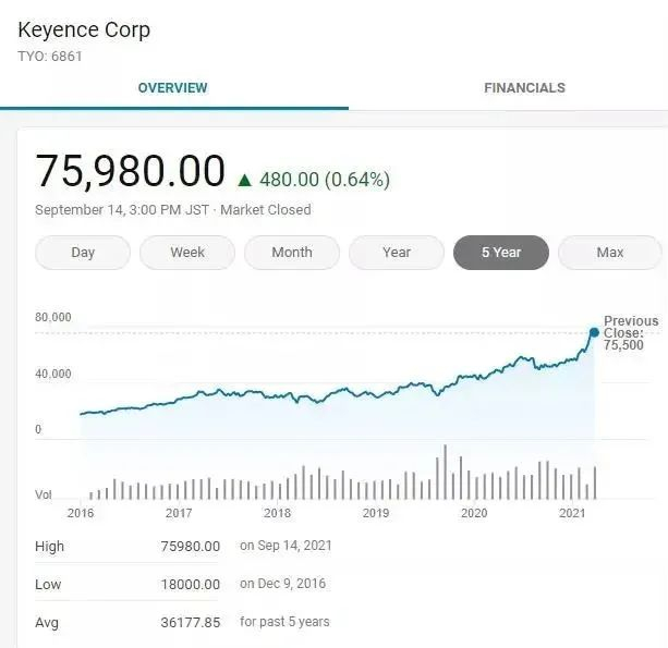 基恩士近五年股价走势