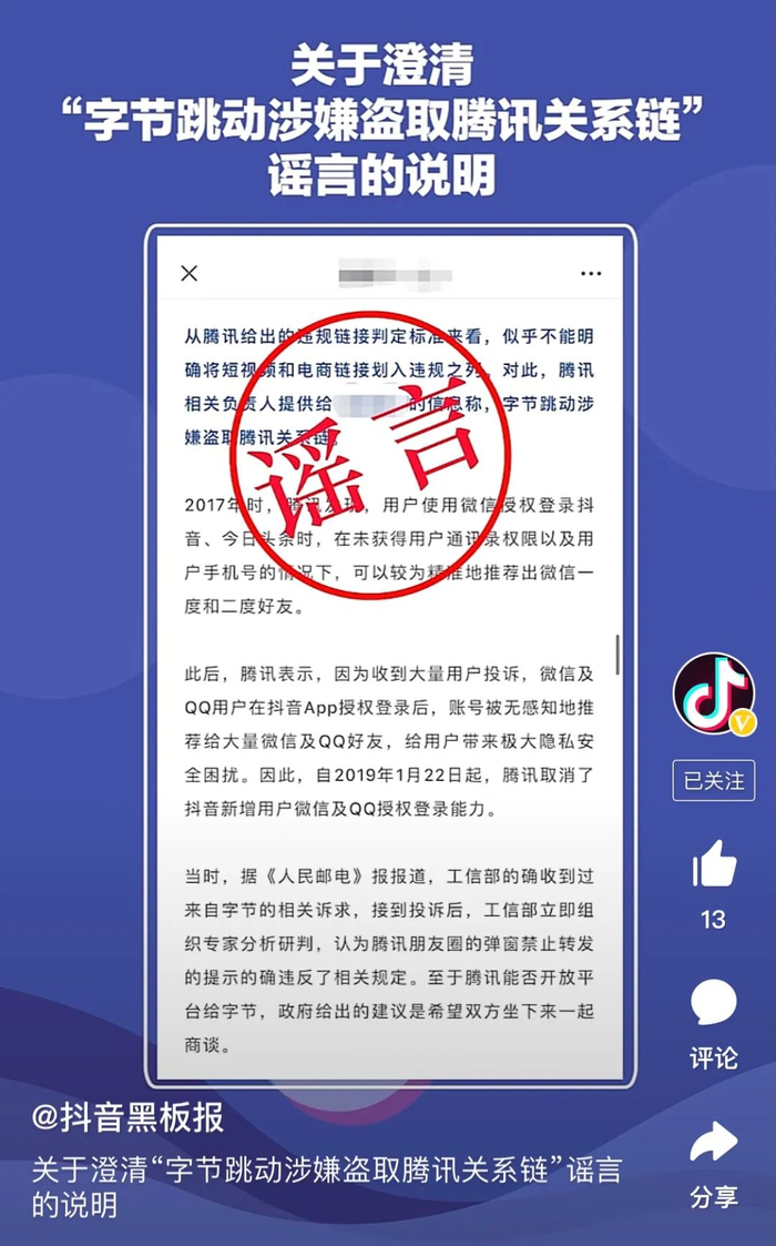 腾讯抖音对打!抖音说腾讯屏蔽链接不公平,腾讯说是因为字节涉嫌盗取腾讯关系链,到底怎么一回事?双方纠纠缠缠这些年,这回谁能赢?