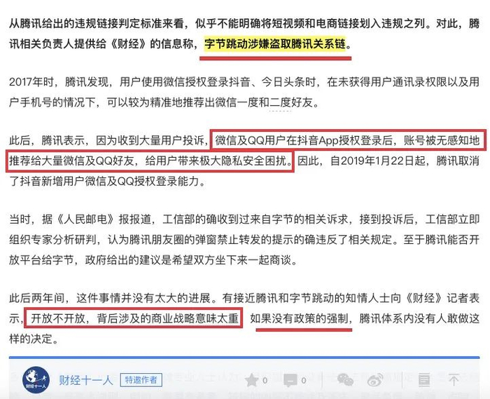 对此,腾讯相关负责人表示:字节跳动涉嫌盗取腾讯关系链,2017年腾讯方面就发现了,后来也一直收到用户投诉。