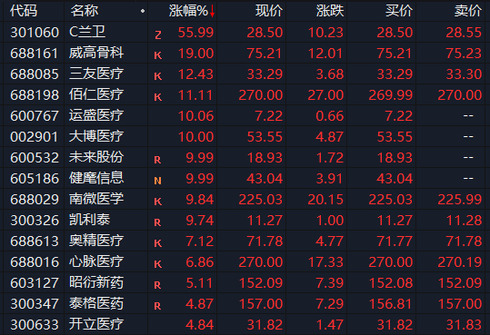 在集采结果出来后,14日午后,部分医疗器械股大幅拉升,威高骨科一度20cm涨停,大博医疗股价10分钟就涨停了;此外,港股上市公司春立医疗收涨10.66%,微创医疗涨超11%。