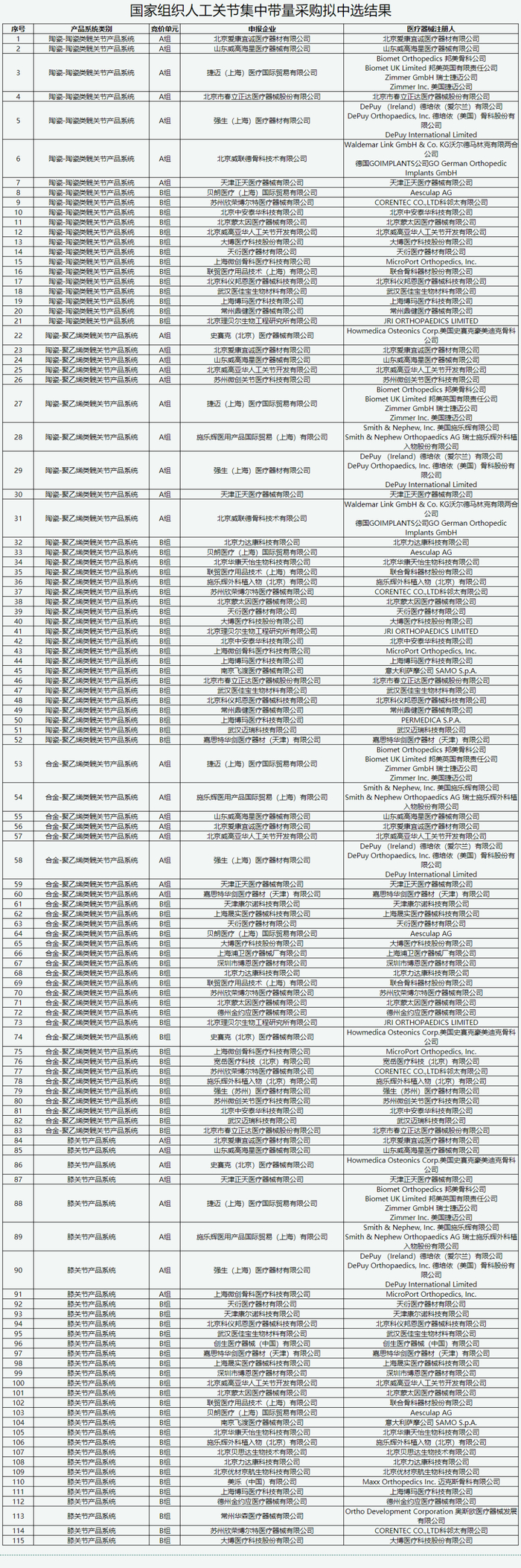 此次人工关节集采中选企业详细名单如下:
