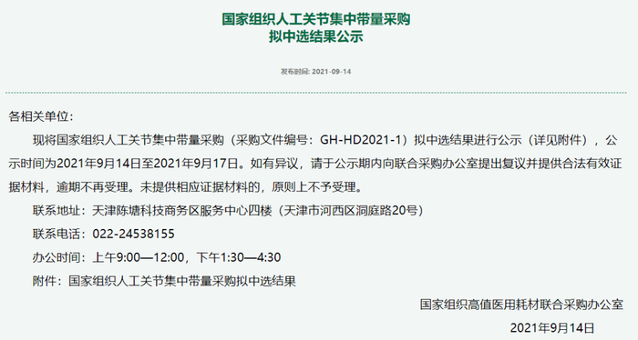 9月14日,国家医保局组织开展人工关节集中带量采购,并产生拟中选结果。本次集采产品为人工髋关节、人工膝关节,集采平均降价82%,预计节约费用160亿元。首年意向采购量共54万套,占全国医疗机构总需求量的90%,采购周期为2年。
