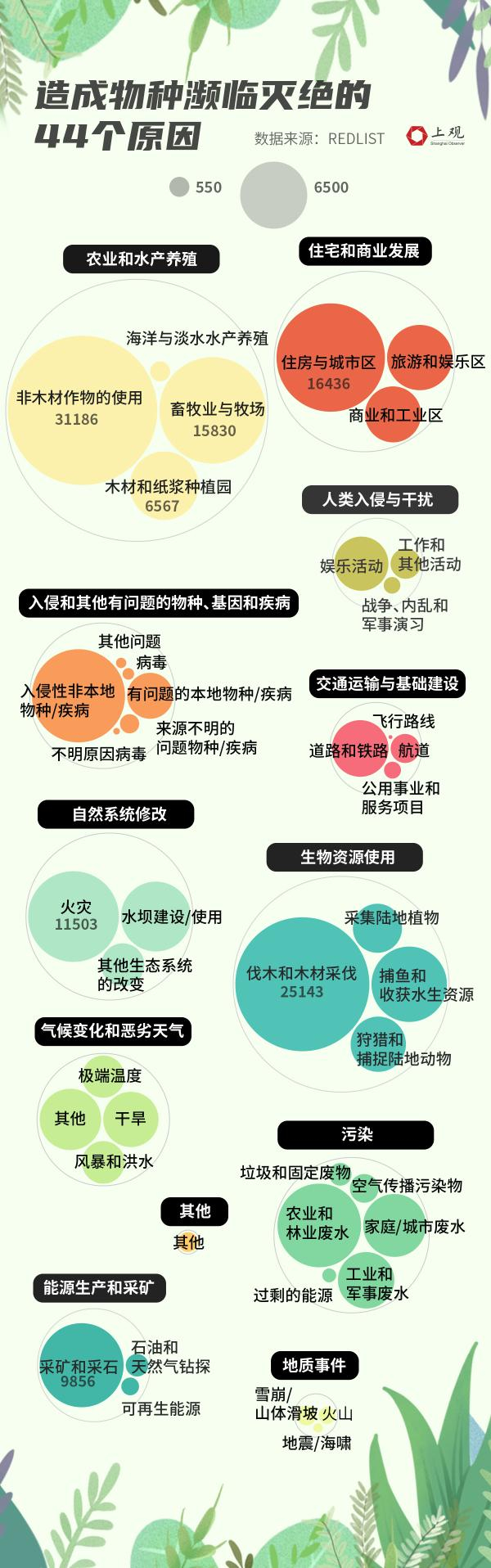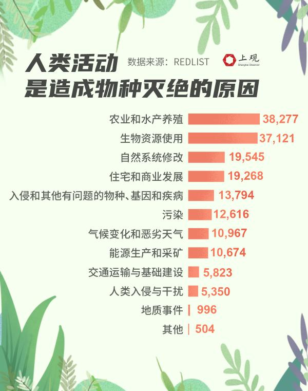 并且,由自然因素造成的物种灭绝属于少数,仅有996种动植物的生存危机与自然因素有关,占总量的0.57%,剩余物种灭绝则或多或少与人类活动有关。