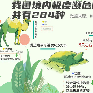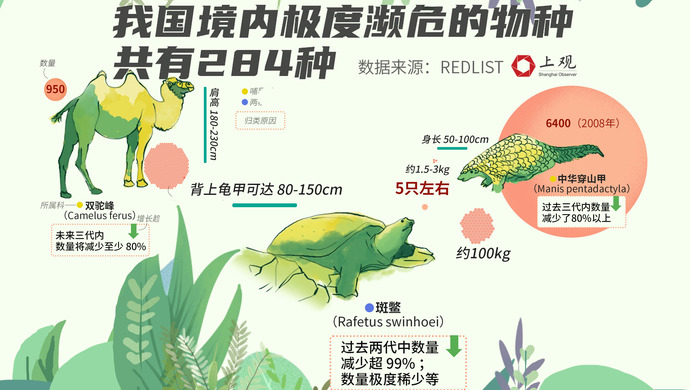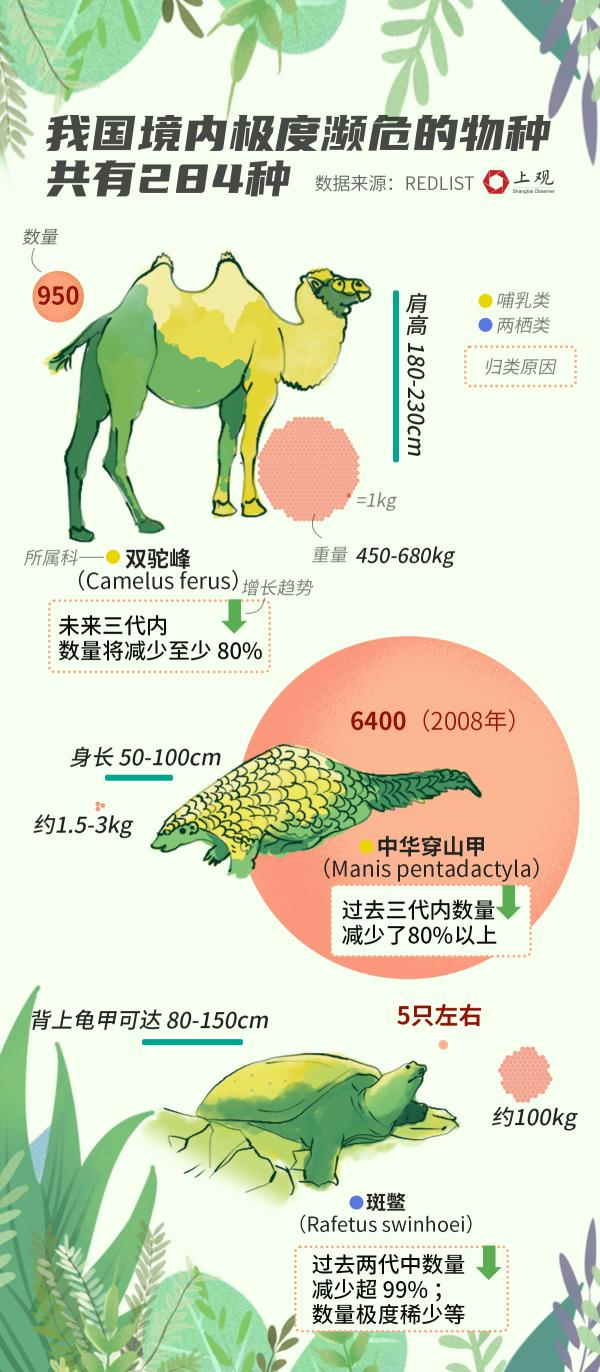 目前,斑鳖、中华穿山甲和双驼峰都已被iucn纳入“极度濒危”的等级,根据iucn的标准,“极度濒危”是受威胁物种中的最高等级。最新数据显示,全球被贴上这个标签的物种共有8404个,其中284个分布在中国境内。