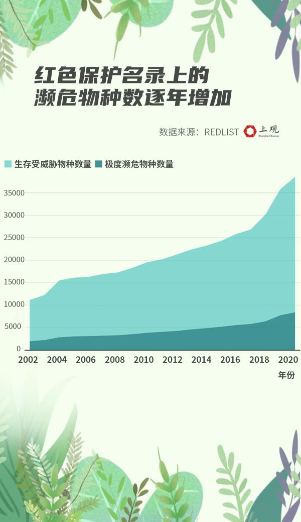 红色保护名录上濒临灭绝的物种逐渐递增。根据iucn统计,2002年时,红色保护名录收集的“受威胁”物种为11000余个,到2020年增长到了38000余个,约占红色保护名录总物种的28%。