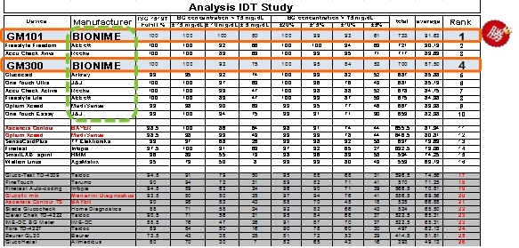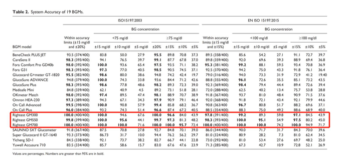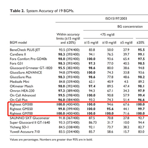论文中指出,在接受评估的19款亚太地区血糖仪中, 有12款有达到ISO 15197:2003 最低准确度要求,却仅有4款符合较严的EN ISO 15197:2015 (ISO 15197:2013)要求。其中,来自华广生技旗下RIGHTEST瑞特品牌的3款血糖仪稳稳占据了精准度排行:GM300,GM550,GM700在多项测试中的表现都十分抢眼,在最终评比结果中准确度力压全球五大厂获得第一名。