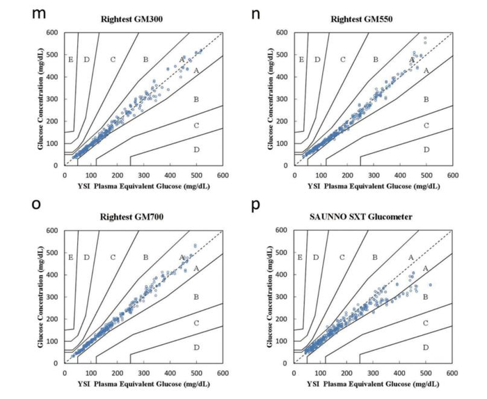 实验数据来自论文《Accuracy Evaluation of 19 Blood Glucose Monitoring Systems Manufactured in the Asia-Pacific Region: A Multicenter Study》