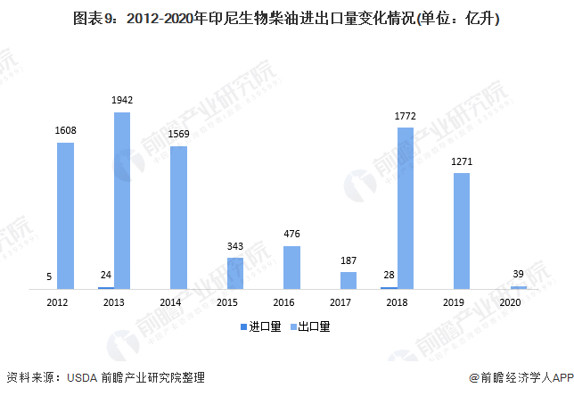 印尼生物柴油行业的快速发展不仅在于政策和国内需求的驱动,还在于海外市场需求的驱动。数据显示,2012-2014年(2013年11月,欧盟对印尼PME开征反倾销关税,重挫其出口)、2018-2019年,印尼生物柴油出口量均在10亿升以上,而进口量少之又少。