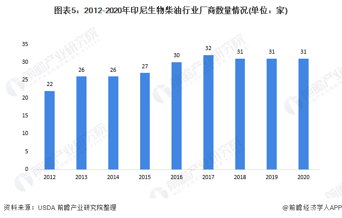 在政策的驱动下,印尼生物柴油的生产商总体,数据显示,2012-2020年,厂商数量由22家增长至了31家: