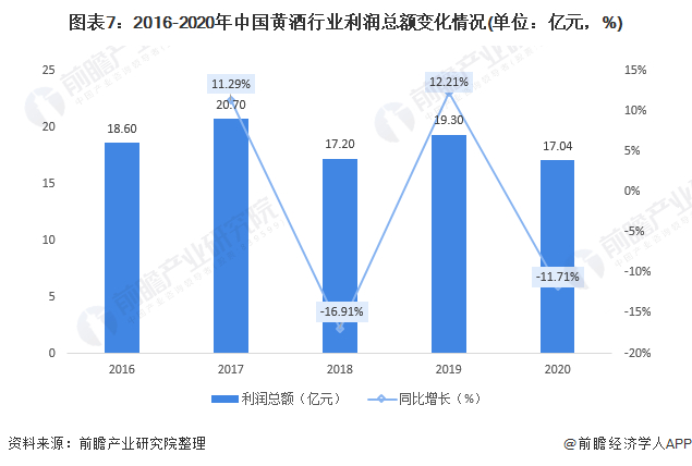 2016-2020年,我国黄酒行业利润总额呈现波动变化,2020年,我国黄酒行业累计实现利润总额17.04亿元,同比下降11.71%。