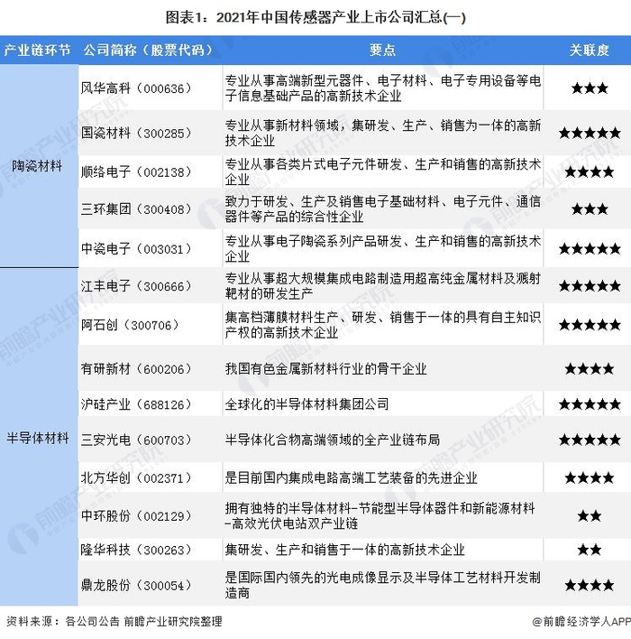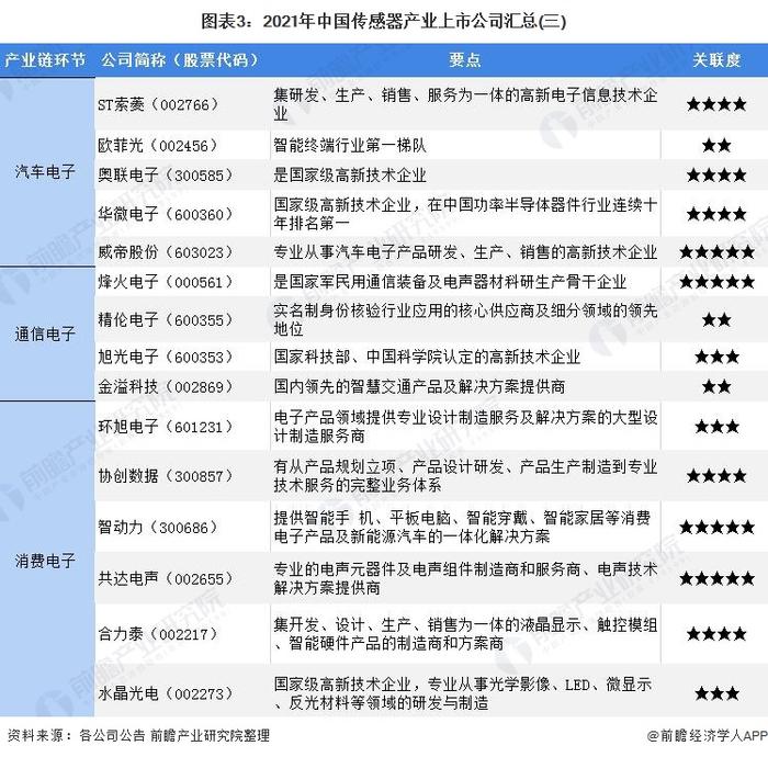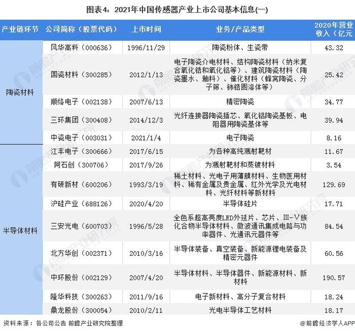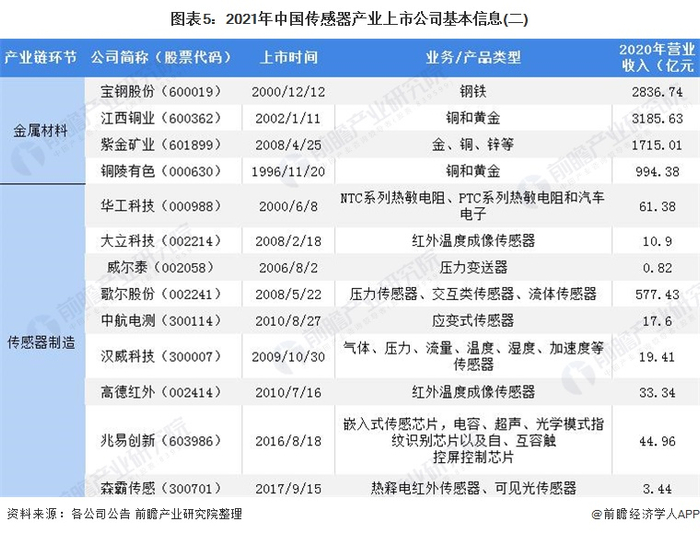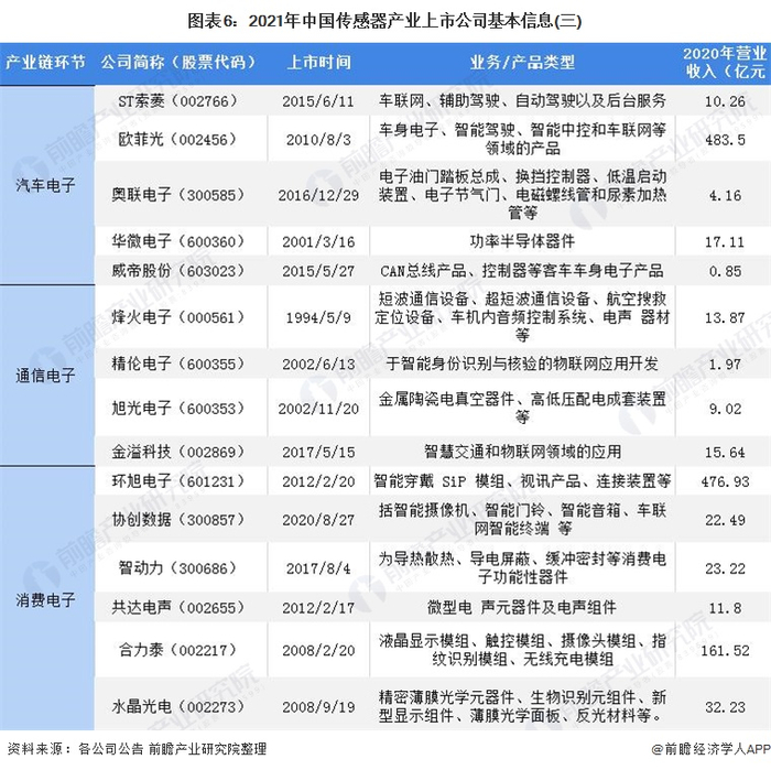 原标题:【最全】2021年传感器行业上市公司全方位对比(附业务布局汇总、业绩对比、业务规划等) 来源:前瞻产业研究院