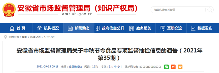 中国质量新闻网讯 9月15日,安徽省市场监督管理局网站发布关于中秋节令食品专项监督抽检信息的通告(2021年第35期)。通告称,中秋节前夕,该局组织开展了2021年安徽中秋节令食品省级专项监督抽检。截至目前,全省共抽检糕点(月饼)食品150批次样品。其中,检出1批次莲蓉蛋黄酥(苏式月饼)不合格,具体情况如下:
