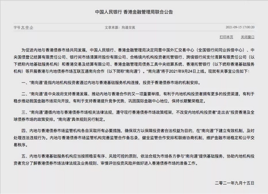 9月15日,央行与香港特区金融管理局(“香港金管局”)发布联合公告,宣布债券“南向通”将于2021年9月24日正式上线。