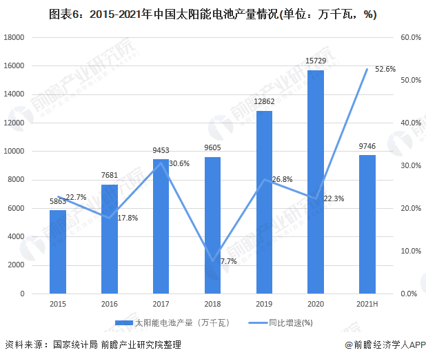 2015-2020年,我国太阳能电池产量呈逐年增加的趋势,根据国家统计局数据显示,2020年我国太阳能电池的产量为15729万千瓦,较2019年同期增长22.3%。2021年上半年,我国太阳能电池的产量达到9746万千瓦,同比增长52.6%。