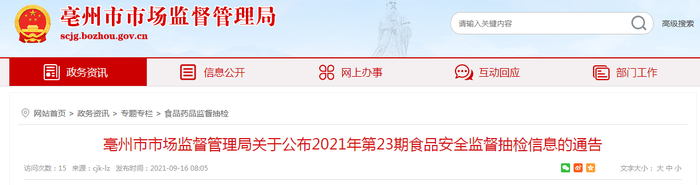 原标题:安徽亳州市市场监管局抽检147批次食品 2批次不合格