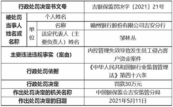 5月17日,银保监会网站公布了两张与赣州银行吉安分行有关的罚单。因“内控管理失效导致发生员工侵占客户资金案件”,赣州银行吉安分行被吉安银保监分局罚款30万元。因“对赣州银行股份有限公司吉安分行内控管理失效导致发生员工侵占客户资金案件的行为负直接责任”,刘文涛被吉安银保监分局终身禁止从事银行业工作。