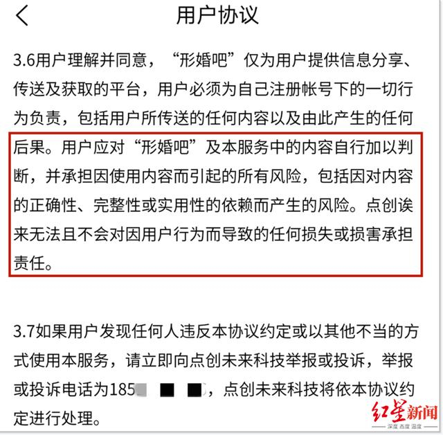 红星新闻记者查询该软件用户条款发现,在风险提示中,该公司明确写道:“用户应对‘形婚吧’及本服务中的内容自行加以判断,并承担因使用内容而引起的所有风险,包括因对内容的正确性、完整性或实用性的依赖而产生的风险。点创诶(未)来无法且不会对因用户行为而导致的任何损失或损害承担责任。”