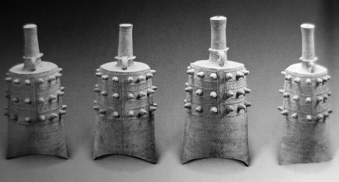 商周时期是中国古代青铜文化最发达的时期,青铜器是这个时期最重要、最精彩的器物。青铜器主要是贵族阶层的祭祀及礼乐用器,但漆器和陶器在日常生活用器中所占的比例更大。原始瓷器的出现和使用,是商周时期物质文化中的新生事物,特别是商和西周时期,在今天看来十分粗糙的瓷器也只会在贵族墓葬中有少量发现。2004年江苏无锡和苏州交界处鸿山东周越国贵族土墩墓群出土了原始瓷器700余件,品种十分丰富,几乎涵盖了青铜礼乐器及生活用器的各个种类,可谓是原始瓷器的梦幻组合,它们的发现填补了中国瓷器发展史中的一项空白,也揭开了中国千年瓷国的序幕。鸿山越国墓的年代大约在公元前473年~公元前468年之间,是越王勾践灭掉吴国后最强盛的时期,墓主人是王以下的贵族阶层。我们知道商周礼乐制度下的墓葬随葬品是有等级划分的,贵族阶层以随葬青铜礼乐器作为身份地位的标志。而鸿山越国墓的礼乐器均是仿青铜礼乐器的原始青瓷、硬陶器和泥质陶器,属于明器,但其鼎、豆、壶礼器组合,编钟、编磬等乐器组合仍按照青铜礼乐器的组合,明示身份等级。