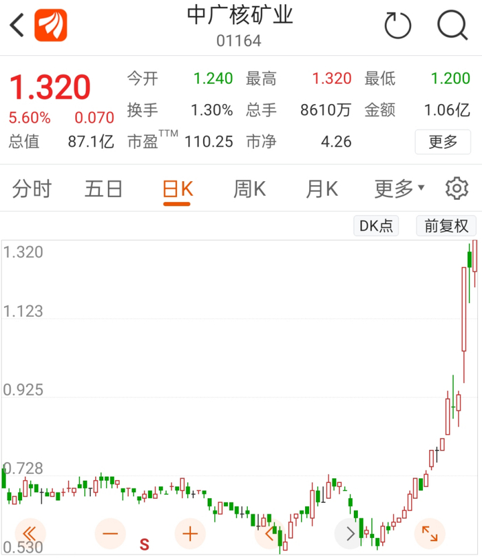 在港股上市的中广核矿业(01164.HK)的股价表现也非常强劲,9月13日暴涨超34%,9月15日再度刷新新高,而自7月27日以来,股价累计涨幅更是超过140%。