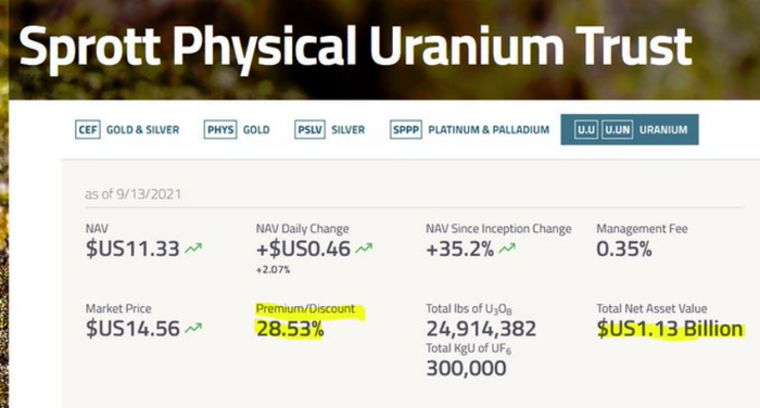 现货市场上的铀也遭到资金疯抢,加拿大的一只实体铀信托基金(Sprott Physical Uranium Trust)在现货市场大肆购买铀,截至目前,该基金已累计购买了近2500万磅铀,相当于全球铀消费量的14%左右,净资产价值已突破10亿美元。