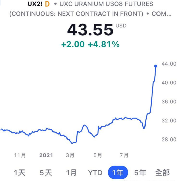 铀市场体量本就不大,突然涌现出如此庞大的购买力,直接引爆了铀价。自8月份以来,铀价格从低点累计上涨已超40%,纽约市场交易的铀期货价格近期一度升至每磅43.55美元,创下了7年来的新高。