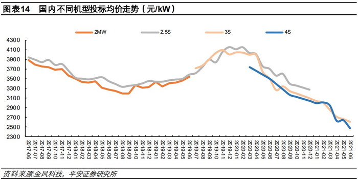 随着招标机型的大型化,2021年以来,风机招标价格呈现较明显的下降。根据近期中标情况,三北、西南地区大型风电项目的风机中标价格已低至2300-2500元/kW,较2020年初的价格高点呈现大幅下降。东中南部地区分散式风电项目的风机产品一般单位千瓦扫风面积更大,价格相对更高,以金风科技 GW150-3.0、GW165-4.0等典型风机产品为例,中标价格已经回落至 3000元/kW 以内。