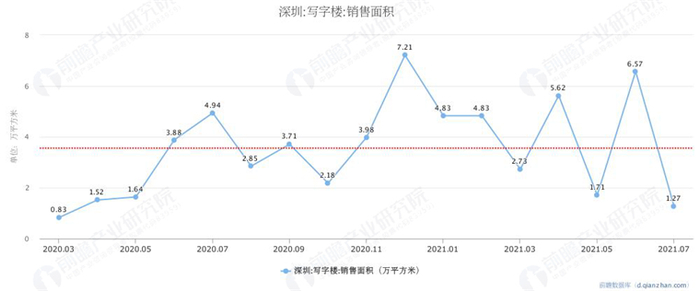 根据前瞻大数据库资料显示,从2020年3月起至2021年6月,深圳写字楼的销售面积浮动比例在0.83~7.21(万平方米)区间,根据时间线显示可见,深圳写字楼的销售状况与疫情阶段性状况影响有较大关联。