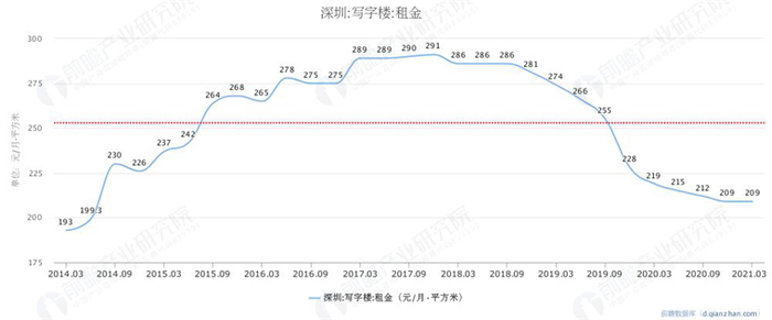 同比区域租金指数也有所收窄,前瞻以季度统计2014年3月至2021年3月的写字楼租金均价显示,已落回五六年前的价格区间,再加上深圳写字楼的可售套数同比疫情阶段已有较好上升趋势,表明深圳写字楼市场已逐步进入回温状态,有办公需求的企业已可选择在此时进驻,在国家对疫情严控及经济调整的举措下,日后只会呈现上涨趋势,恐怕难以再度回到“低谷企业福音”的区间。
