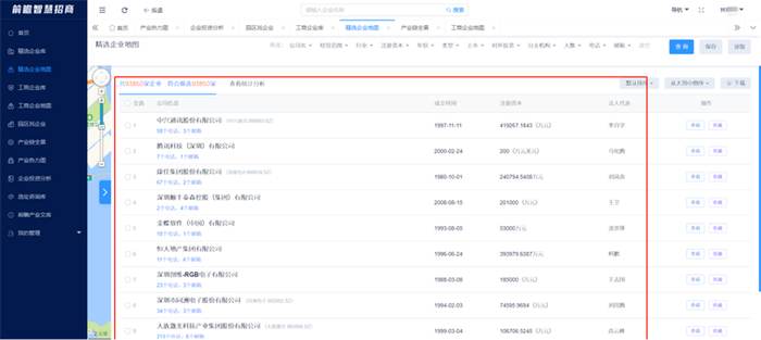 在数据图库上,以深圳南山中心区半径约4028米的范围内显示,精选企业总数约为93850家,除了上述的人工智能产业发展势态成熟外,其中大部分以TMT、金融等产业巨头企业为主,例如中兴通讯、康佳集团、顺丰泰森控股、金蝶、创维、大族激光等等……
