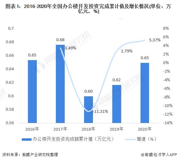 众所周知,我国办公楼市场发展与宏观经济存在较大的关联度,2020年我国成为全球唯一实现经济正增长的主要经济体,国内生产总值历史上首次突破100万亿元,展现了我国强大的发展能力,带动办公楼开发市场加速增长,2020年达0.65万亿元,同比增长5.37%,增长速度实现历史新高。