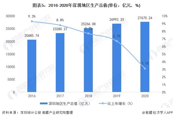 深圳作为粤港澳大湾区重要战略城市之一,2020年深圳实现地区生产总值27670.24亿元,比上年增长3.1%,三次产业结构0.1:37.8:62.1,其中第三产业占整体GDP份额逐年提升,第二产业增加值比重快速下降。