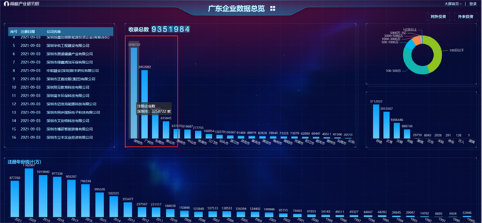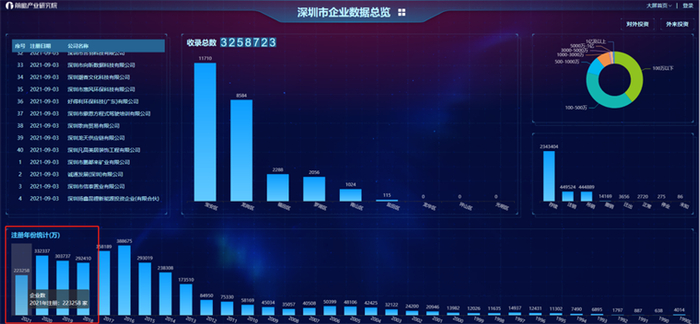 那么同比在中国地区实现经济主体增长带动的一线城市中,以上述深圳为例,在疫情之后的产业经济发展保持着一定的韧性浮动,在前瞻智慧数据库中可以看到,今年截止至2021年9月3日11时间,深圳新登记企业主体达22.3258万户,实时累计企业主体达325.8722万户;