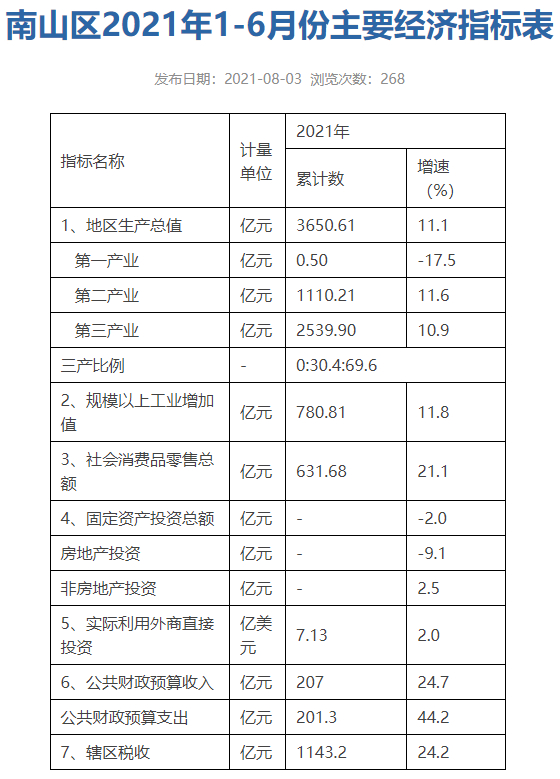 而深圳南山区的产业结构发展,则是以“科技+金融”为导向的数字经济、5G通信、集成电路、人工智能、文化创意、生物医药、海洋经济等产业作为细分发展领域。而三大产业的比例为0:30.4:69.6,不难看出其中第三产业包括但不限于固定资产投资、社会消费品零售、对外贸易、金融等为主的产值依然占全区经济比重最高,属于拉动经济增长的主要引擎。加之,在2021年7月2日时,南山区人民政府发布了关于《深圳市南山区国民经济和社会发展第十四个五年规划和二〇三五年远景目标纲要》。该项文件中明确指出了关于未来南山发展的经济指标。深圳市确定2025年地区生产总值将达到4万亿元。南山作为深圳的经济大区,面向未来必须勇挑重担。决定提出2025年我区GDP达到1万亿元,占全市比重从“十三五”时期的23.2%提高到25%。