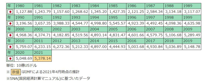 1980年以后日本GDP的总体状况。出处:《世界経済のネタ帳》