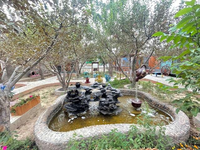 走进同样作为5户示范户之一的李文彬家的共享庭院,几颗长势茂盛的苹果树环抱着一个石头砌的小水池,水池上面悬着一盏茶壶,流水不断地自壶嘴流向下面的茶杯,激起朵朵水花,引得前来游玩的小朋友兴奋不已。