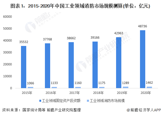 消防在工业领域的主要应用集中在石化、冶金、电力和通信设备等行业,其市场规模与下游行业的投资支出直接相关。根据行业经验,一般工业领域消防投入占行业固定资产投资支出的比例在3%左右,据此测算,2020年中国工业领域消防市场规模约为1462亿元。