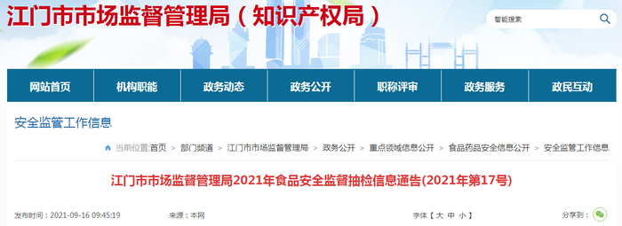 中国质量新闻网讯 2021年9月16日,广东江门市市场监督管理局网站发布2021年食品安全监督抽检信息通告(2021年第17号)。