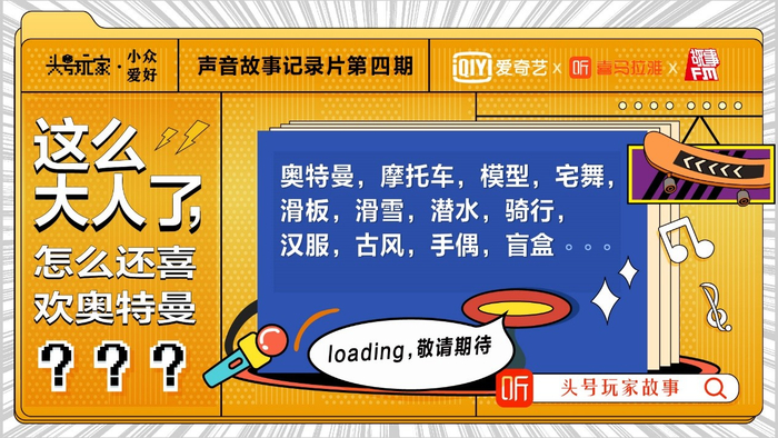 爱奇艺“头号玩家”系列内容包含三部分:声音纪录片、独家制作的创意短片,以及联合网易文创·浪潮工作室推出4篇系列故事,力图通过视频、文字、音频多维度的作品协同上线,呈现中国年轻人对兴趣的理解和创造。