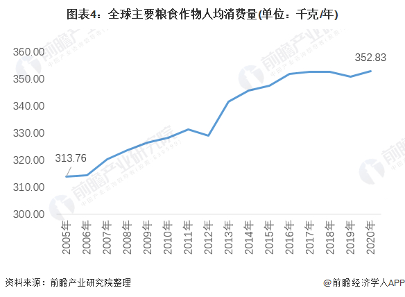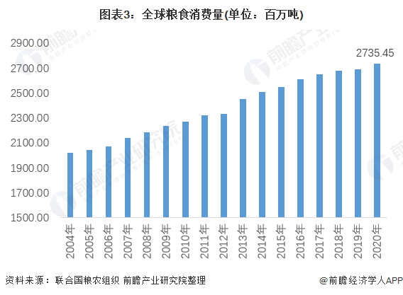 随着全世界人民生活水平的不断提高,21世纪以来,全球粮食消费量不断提升,2020年全球主要粮食作物的表观消费量大约为27.35亿吨,同比增长1.6%。