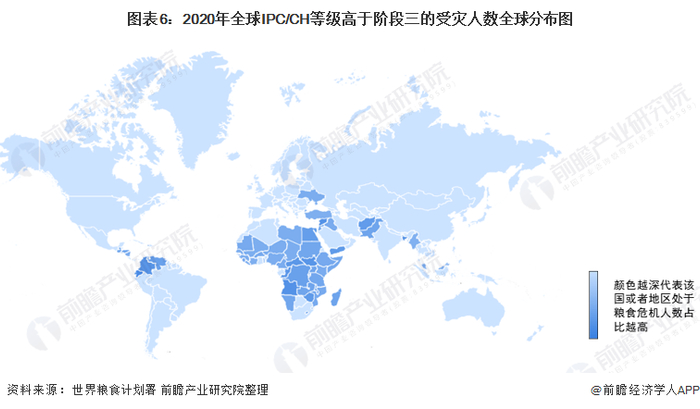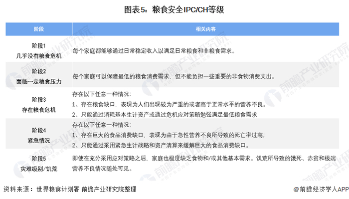 2020年尽管从粮食的供需来看,全球人均粮食消费量是不断提升的,且远高于正常人类所需水平,但从客观事实来看,由于经济发展不平衡、地区冲突等因素,全球仍然存在着较为严峻的粮食危机问题。根据世界粮食计划署的粮食安全阶段综合分类(IPC)和协调框架(CH)等级,粮食安全IPC/CH等级被分为5个阶段。其中处于第三阶段或以上阶段即为处于粮食危机。