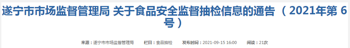 中国质量新闻网讯 近日,四川省遂宁市市场监督管理局发布关于食品安全监督抽检信息的通告 (2021年第 6号)。