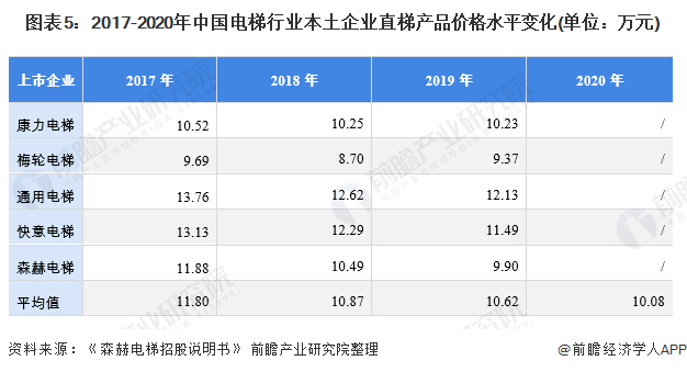 当前,电梯行业已处于充分竞争状态,导致电梯整机销售价格逐渐下滑。根据中国本土上市企业的平均直梯售价的数据,2017-2019年,中国电梯行业直梯产品价格水平呈现下降趋势,平均单价由2017年的11.80万元下降至2019年的10.62万元,初步推算,2020年中国电梯行业本土品牌直梯产品平均单价在10.08万元左右。此外,根据招投标项目外资品牌中标单价数据测算,2020-2021年外资品牌的电梯产品平均单价在40万元至45万元的范围内。