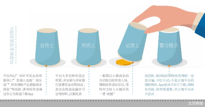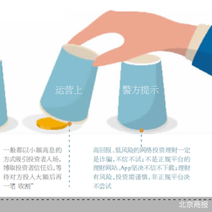 “高回报、低风险的网络投资理财一定是诈骗,不信不试;不是正规平台的理财网站、App坚决不信不下载;理财有风险,投资需谨慎,非正规平台决不尝试。”北京商报记者注意到,针对类似互联网理财骗局,多地警方也已发布提示。