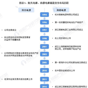 储能是指在能量富余的时候,利用特殊技术与装置把能量储存起来,并在能量不足时释放出来,从而调节能量供求在时间和强度上的不匹配问题。目前,中国储能行业的龙头企业分别是阳光电源(300274)、南都电源(300068),两家企业在储能业务上的布局历程如下: